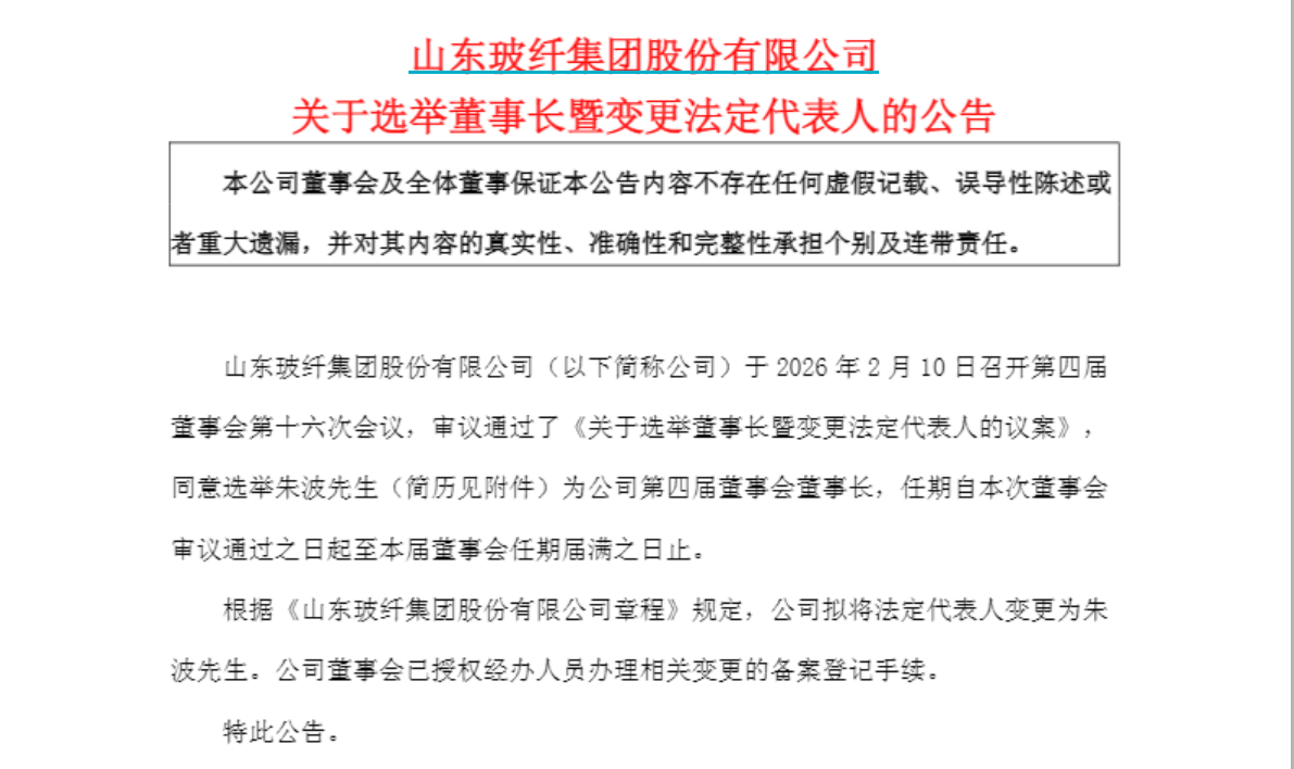 继2月9日,披露前董事长张善俊到龄退休的公告后,2月10日,山东玻纤(605006.SH)发布新董事长任职的公告。公告显示,朱波被选举为公司董事长,同时拟将法定代表人变更为朱波,已授权经办人员办理相关变更的备案登记手续。