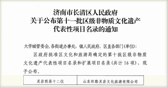 2月11日,济南市长清区人民政府第十一批区级非物质文化遗产代表性项目名录公布,“灵岩煎茶十二仪”成功入选,标志着这项承袭唐宋煎茶风韵的古老技艺正式获得非遗认定与保护。