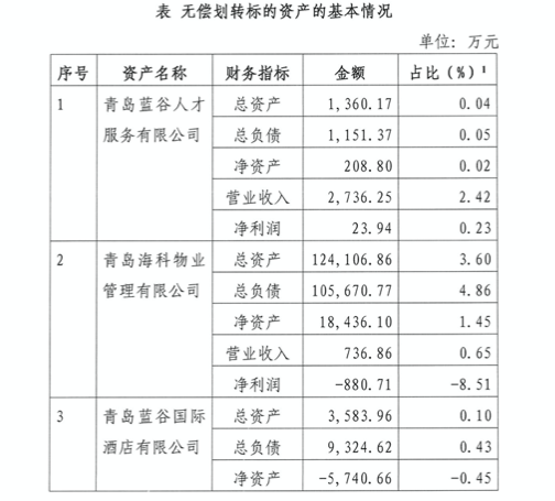 2月10日,青岛海洋科技投资发展集团有限公司(下称“青岛海洋科投集团”)发布公告称,为优化调整国有资本布局,将其持有的青岛蓝谷人才服务有限公司100%股权、青岛海科物业管理有限公司100%股权、青岛蓝谷国际酒店有限公司100%股权以及青岛蓝谷产业发展有限公司55%股权无偿划转至青岛蓝谷高创控股有限公司(下称“蓝谷高创”)。