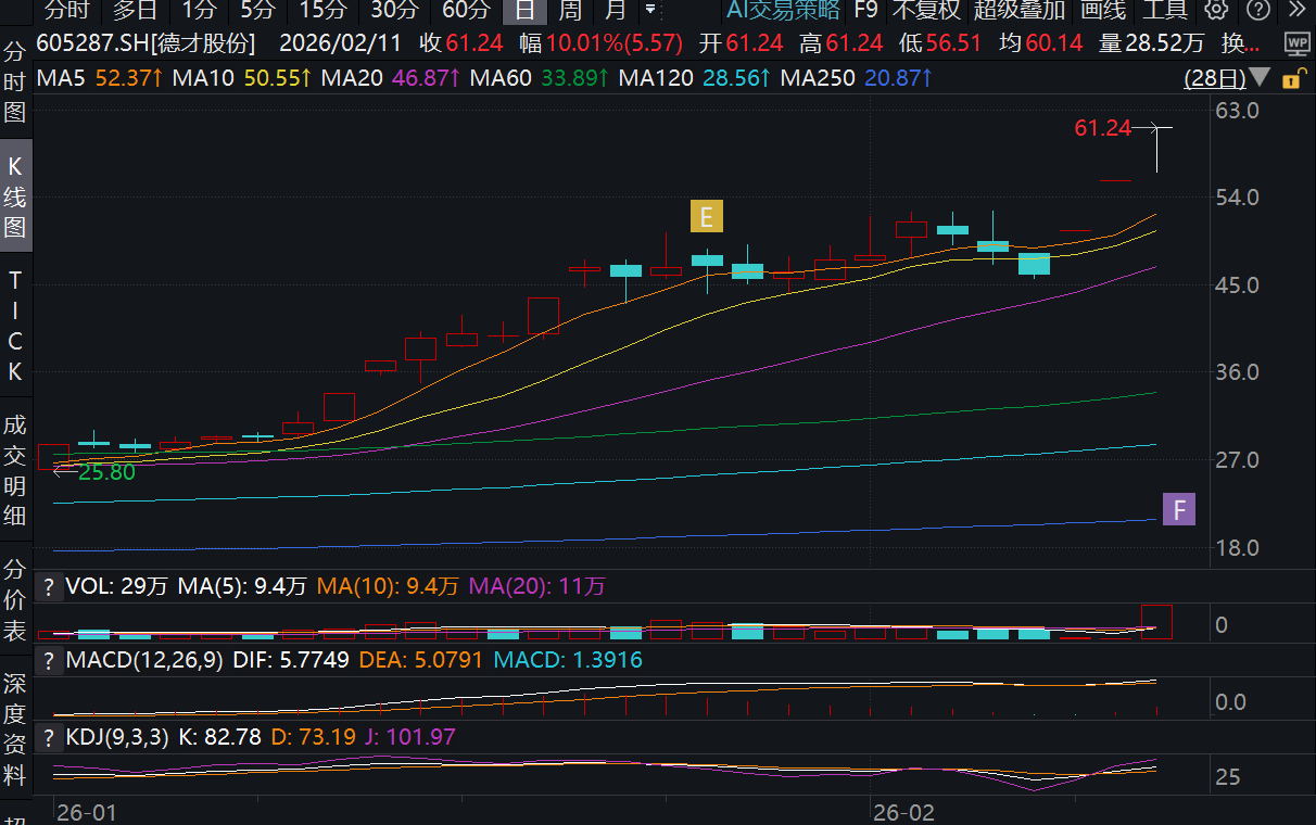 2月11日,已连收两个涨停板的德才股份(605287.SH)再次“10cm”封板涨停,报收于61.24元/股,创历史新高,全天换手率20.37%,成交量28.52万手。