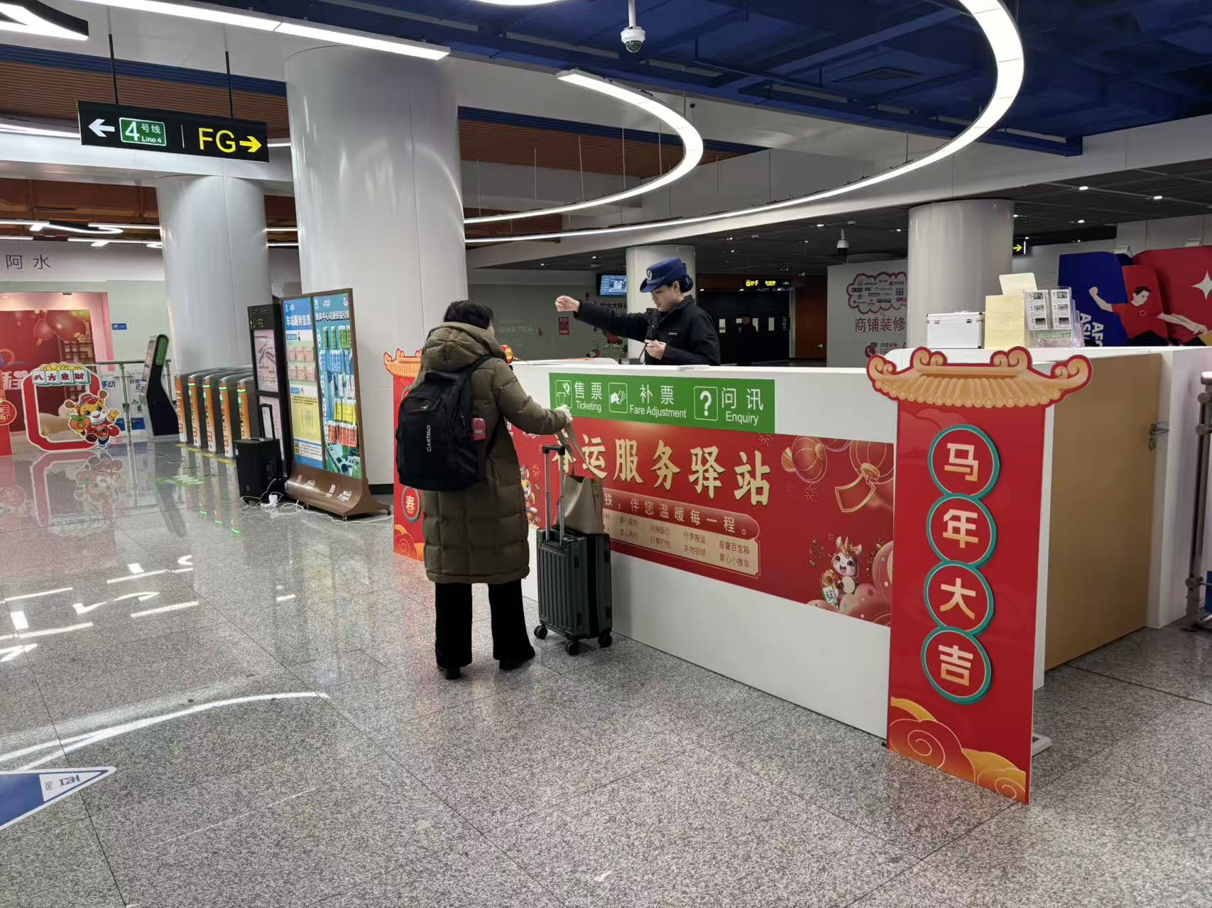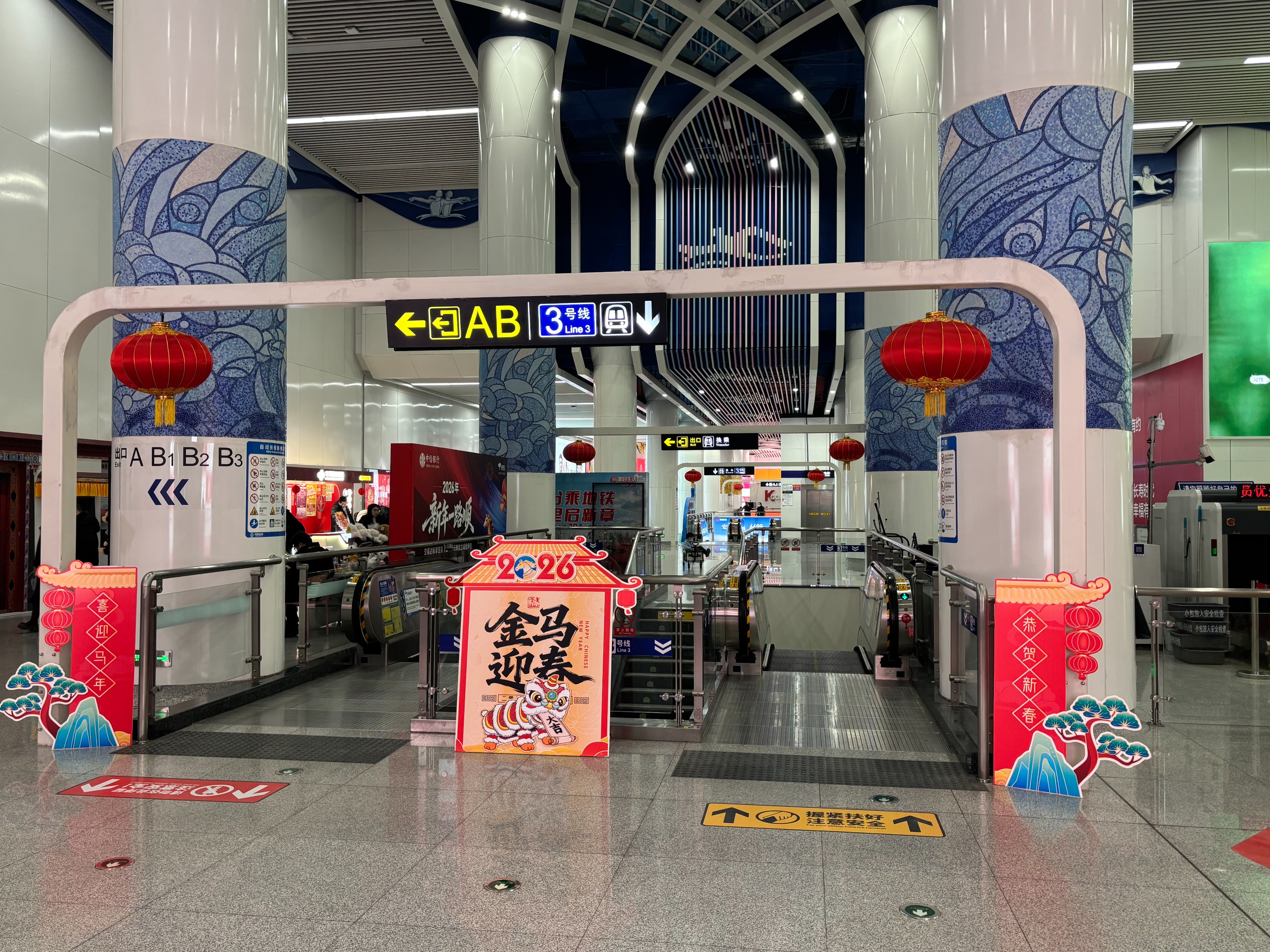 作为三号线与四号线的交通枢纽,济南奥体中心站的新春氛围尤为浓厚。踏入站内,红灯笼高悬于通道两侧,红绸点缀其间,让往来乘客直观感受到“春节越来越近了”。