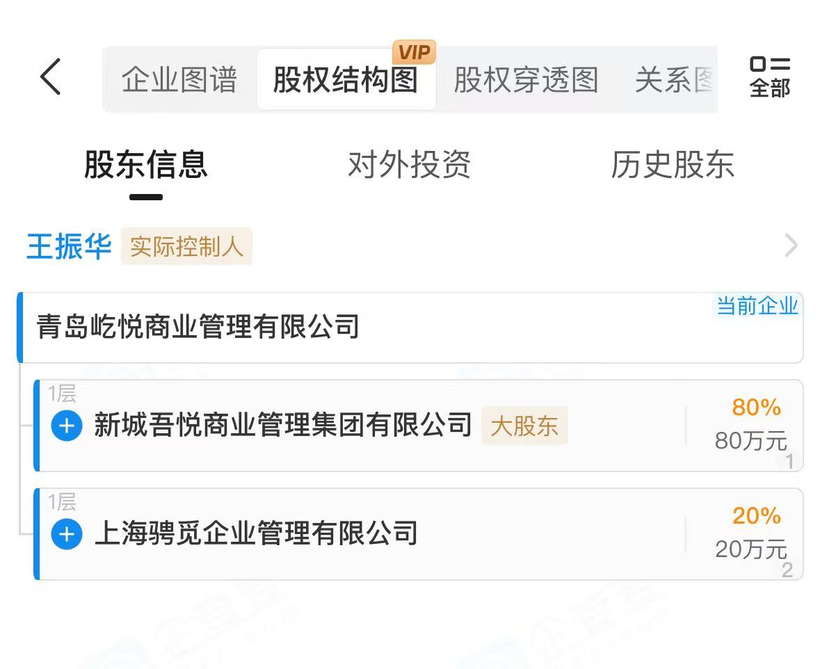 股权穿透后,该公司由新城控股(601155.SH)旗下新城吾悦商业管理集团有限公司、上海骋觅企业管理有限公司共同持股,持股比例分别为80%、20%。