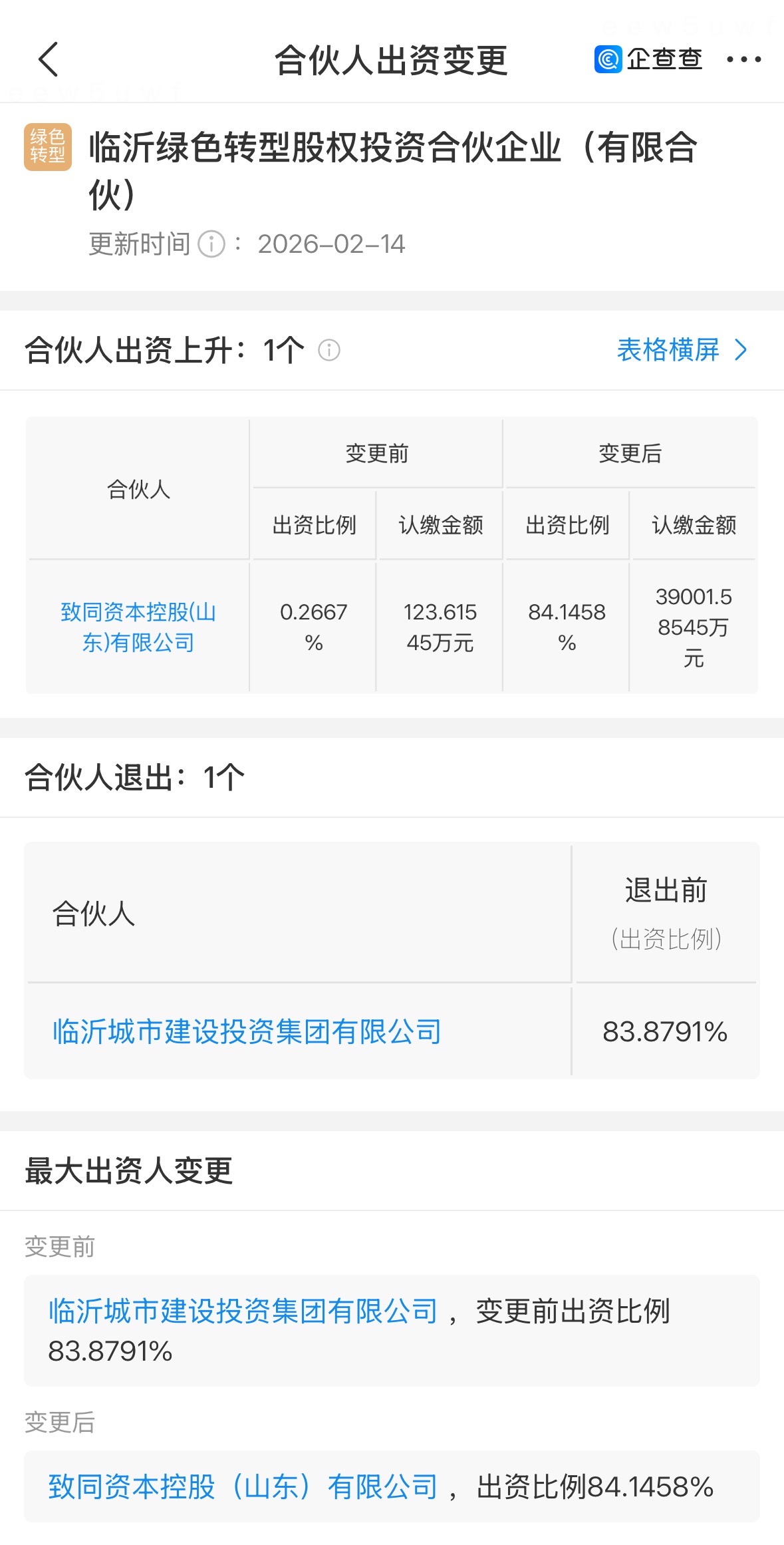 企查查显示,2月14日,临沂城市建设投资集团有限公司(下称“临沂城投集团”)退出临沂绿色转型股权投资合伙企业(有限合伙)。退出前,临沂城投集团出资比例为83.88%;临沂城投集团全资子公司致同资本控股(山东)有限公司(下称“致同资本”)接盘,出资比例由原来的0.27%增加到了84.15%。此次股权调整系临沂城投集团优化国有资本的新动作。