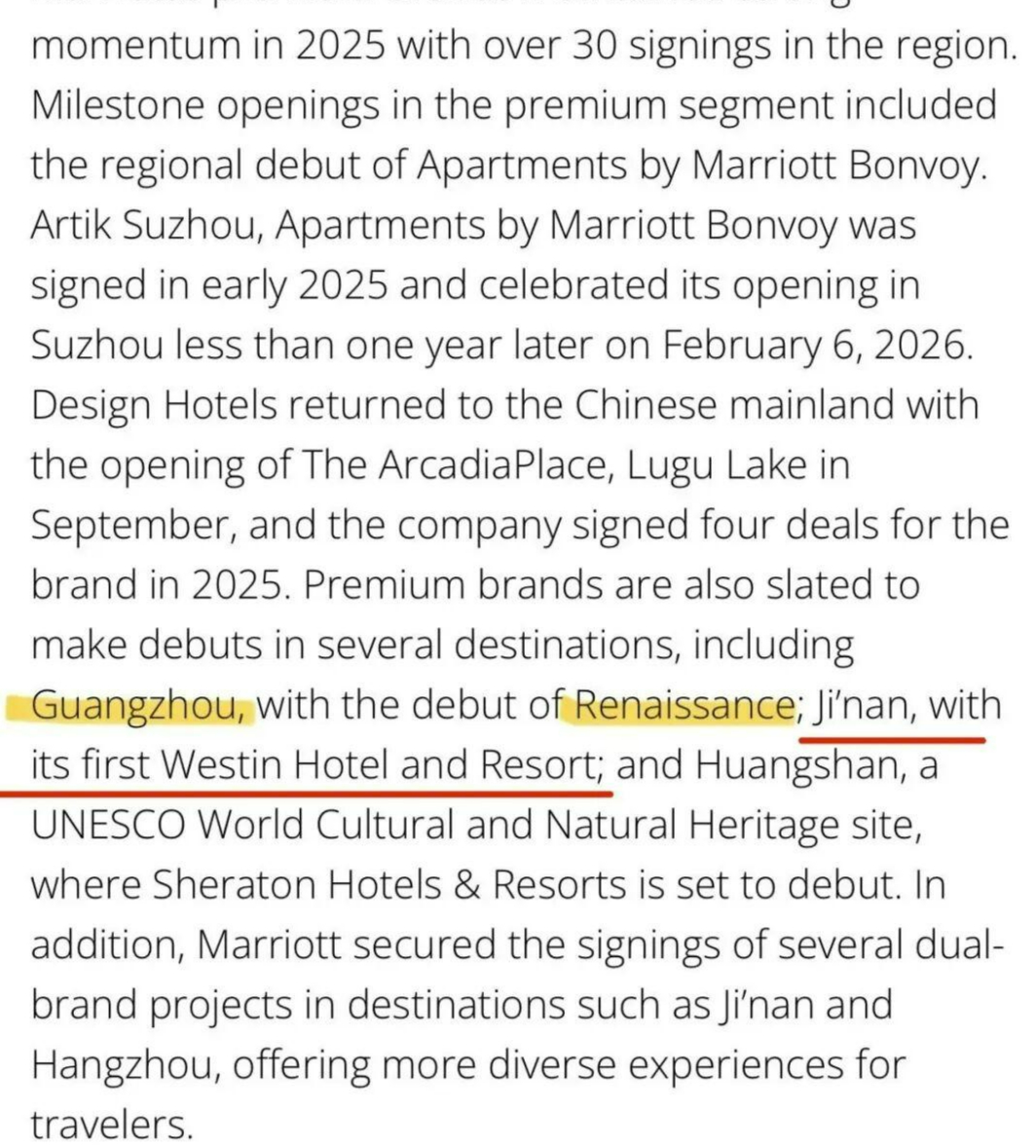 万豪国际酒店集团近日宣布,2025年万豪国际大中华区开发项目签约项目及签约客房数量再创历史新高,其中,威斯汀酒店及度假村将落子济南,将威斯汀品牌标志性的健康生活方式带到泉城。2025年万豪国际还实现了多个“双品牌”项目签约,如济南黄河国际会展中心威斯汀酒店与源宿酒店。