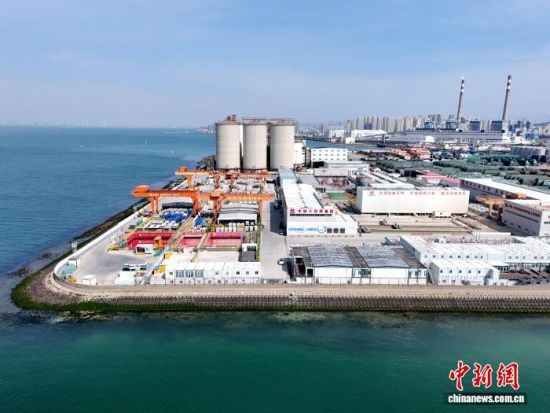 3月8日,青岛胶州湾第二隧道项目地面施工现场。(无人机照片)丁翔 摄