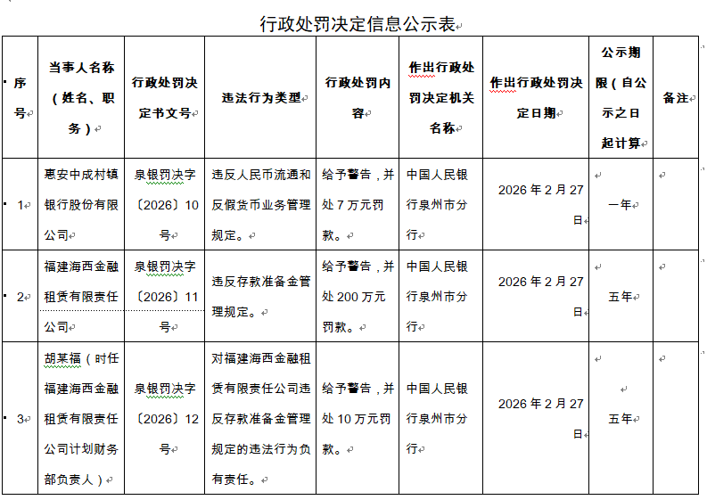 3月9日,中国人民银行泉州市分行披露的行政处罚信息显示,因违反存款准备金管理规定,福建海西金融租赁有限责任公司被中国人民银行泉州市分行警告并罚款200万元;时任该公司计划财务部负责人胡某福对此违法行为负有责任,被警告并罚款10万元。作出行政处罚的决定日期为2026年2月27日。