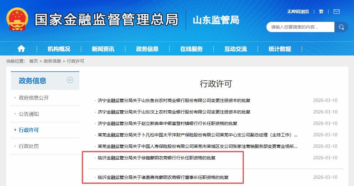 3月10日,国家金融监督管理总局山东监管局发布公告称,临沂金融监管分局已核准诸葛善伟蒙阴农商银行董事长的任职资格,核准徐锴蒙阴农商银行行长的任职资格,批复时间均为2026年3月4日。