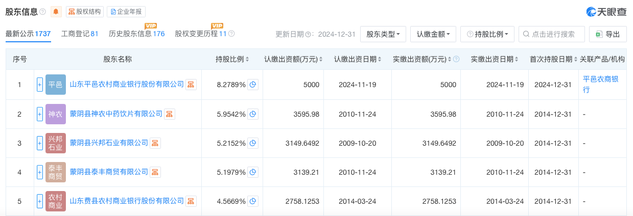 在股东结构方面,蒙阴农商银行股权较为分散。天眼查显示,该行共有股东1737户,其中自然人股东1681户,企业法人56户。持股比例超5%的股东有4户,平邑农商银行为其大股东,持股比例为8.2789%;其次为蒙阴县神农中药饮片有限公司,持股比例为5.9542%;蒙阴县兴邦石业有限公司、蒙阴县泰丰商贸有限公司分别是其第三、四大股东,持股比例分别为5.2152%、5.1979%。