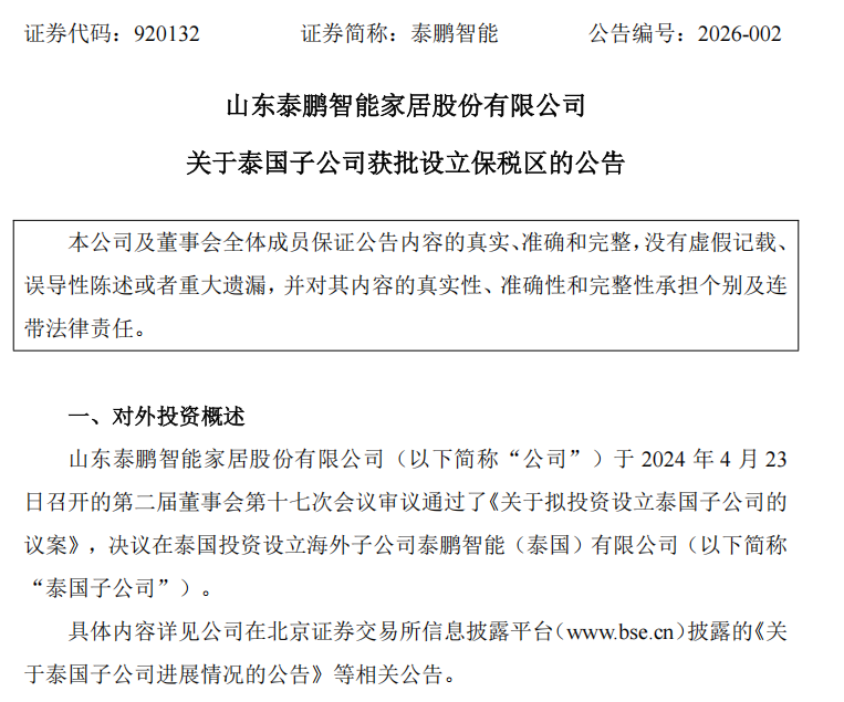 3月9日,山东泰鹏智能家居股份有限公司(920132.BJ,下称“泰鹏智能”)发布公告,宣布全资子公司泰鹏智能(泰国)有限公司(下称“泰国子公司”)近日正式获得泰国海关总署批复,获准在厂区内设立内部保税区,定名“TAIPENG FREE TRADE ZONE”,专项用于开展工业生产经营活动。