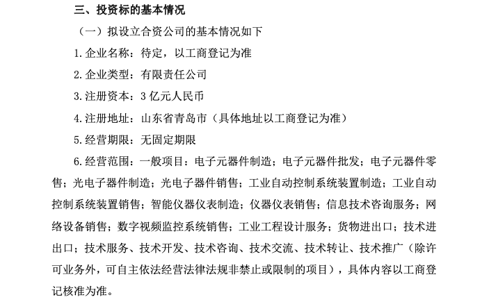 公告披露,拟设立的合资公司投资总额预计为15亿元,注册资本为3亿元,注册地址为山东省青岛市(具体地址以工商登记为准)。双方约定,待项目公司取得12亿元的银行贷款审批文件后(银行贷款额度以最终的银行批复额度确定),将分别以货币形式出资1.5亿元,各持有合资公司50%的股权。