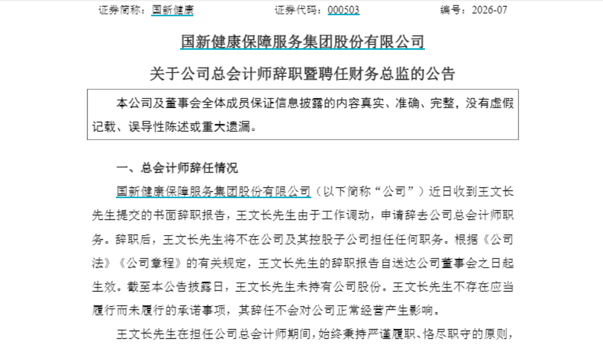 3月10日晚,国新健康(000503.SZ)发布公告称,总会计师王文长因工作调动辞职。同时,公司聘任金津为财务总监,担任公司财务负责人,负责组织公司各项财务管理工作。