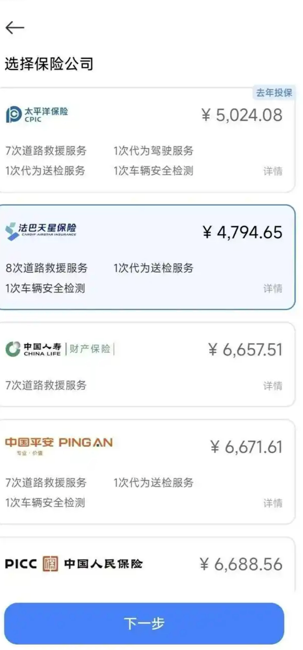 北京厚积保险经纪有限公司提供给媒体的图片显示,法巴天星提供的车险服务包含8次道路救援服务、1次代为送检服务和1次车辆安全检测。整体来看,该车险不仅价格更低,而且权益多于其他公司车险。