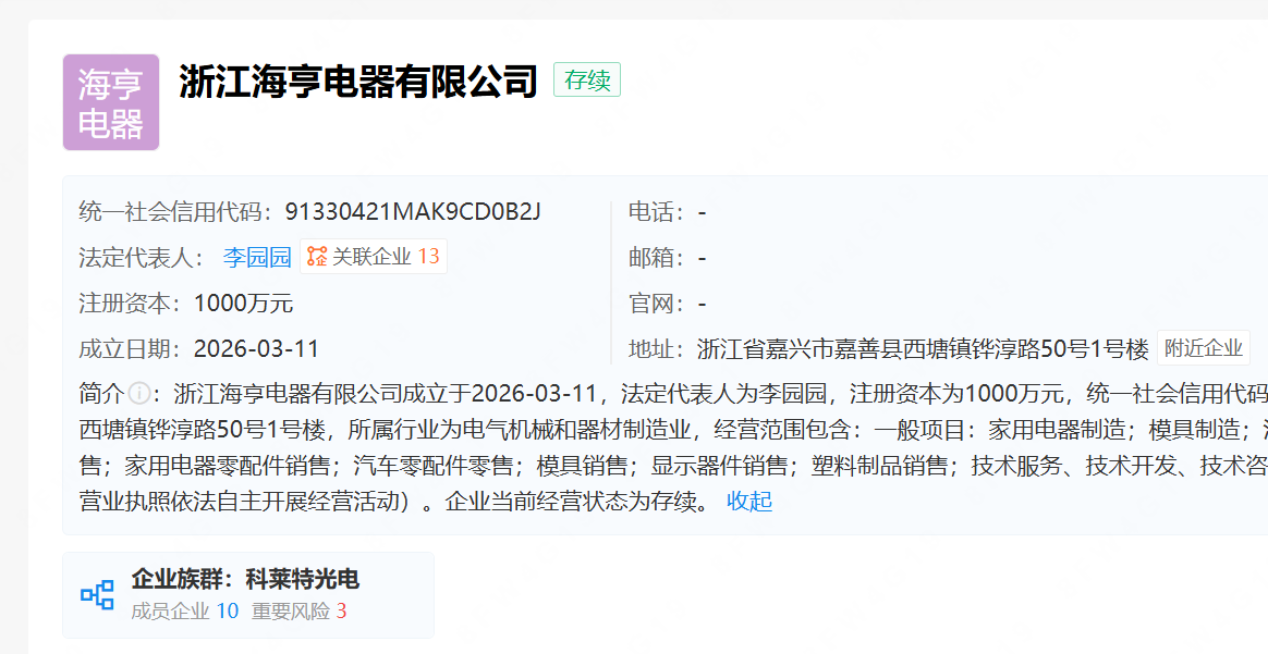 企查查显示,3月11日,青岛科莱特光电科技有限公司(下称“科莱特光电”)在浙江成立全资子公司——浙江海亨电器有限公司(下称“浙江海亨电器”)。
