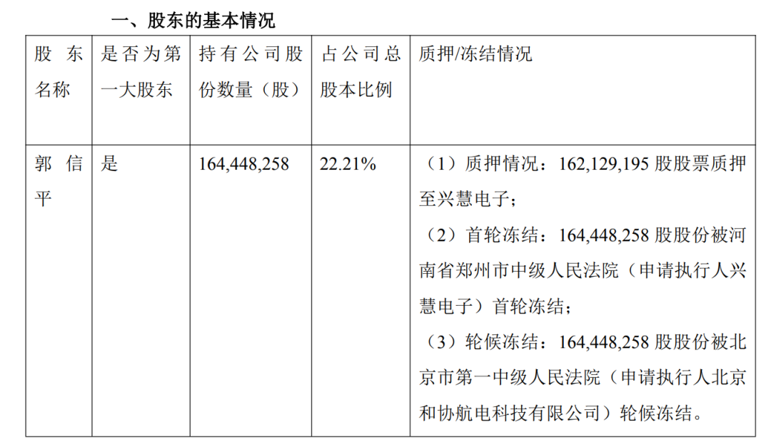 在此次债务纠纷升级之前,郭信平所持公司股份早已处于高比例质押、冻结的状态。根据合众思壮2026年1月4日公告披露,郭信平持有的股份中约1.62亿股质押给了兴慧电子,质押原因正是双方的债务纠纷。
