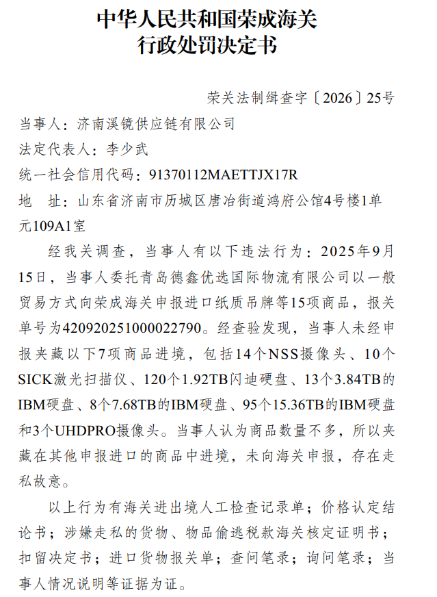 近日,荣成海关披露关于济南溪镜供应链有限公司(下称“济南溪镜供应链”)走私案的行政处罚决定书(荣关法制缉查字〔2026〕25号),经荣成海关调查,当事人有以下违法行为:2025年9月15日,当事人委托青岛德鑫优选国际物流有限公司以一般贸易方式向荣成海关申报进口纸质吊牌等15项商品,报关单号为420920251000022790。经查验发现,当事人未经申报夹藏以下7项商品进境,包括14个NSS摄像头、10个SICK激光扫描仪、120个1.92TB闪迪硬盘、13个3.84TB的IBM硬盘、8个7.68TB的IBM硬盘、95个15.36TB的IBM硬盘和3个UHDPRO摄像头。当事人认为商品数量不多,所以夹藏在其他申报进口的商品中进境,未向海关申报,存在走私故意。