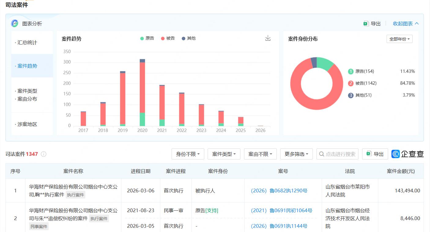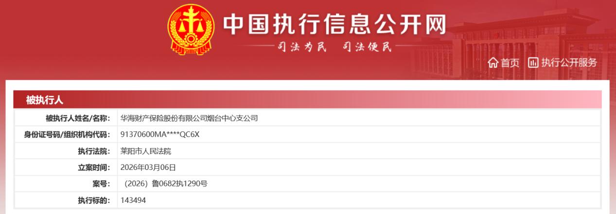 日前,华海财产保险股份有限公司(以下简称“华海保险”)一家分支机构被法院列入被执行人名单。该公司烟台中心支公司被莱阳市人民法院立案执行,执行标的14.35万元,立案时间为2026年3月6日。