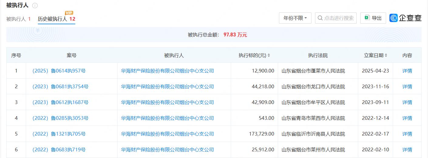 企查查显示,华海保险烟台中心支公司现存历史被执行人信息12条,被执行总金额97.83 万元。据了解,该公司上述12起被执行案件中包括多起车险理赔案件引发的诉讼纠纷,华海保险烟台中心支公司因拒不履行生效法律文书确定义务多次被法院立案执行。