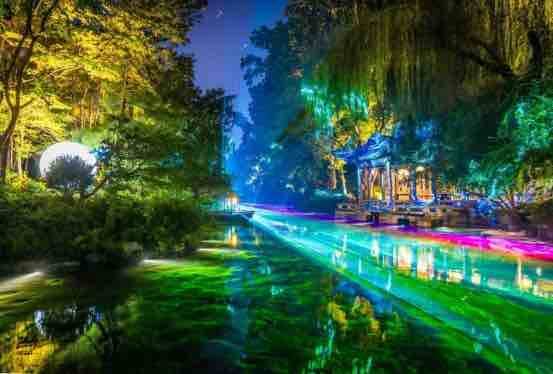 水下光影精准追踪,让奔涌的泉脉在夜色中呈现出灵动的纹理,水泡升腾的轨迹被光影定格,宛如星河坠入泉眼;亭台楼阁在光影晕染下褪去古朴轮廓,与水中倒影相映成趣,一步一景皆成画。景区内的枫溪、泺苑、李清照纪念堂和趵突泉主泉池等区域,皆被赋予光影魔法,光影流转间,古泉的历史脉络在夜色中徐徐展开。
