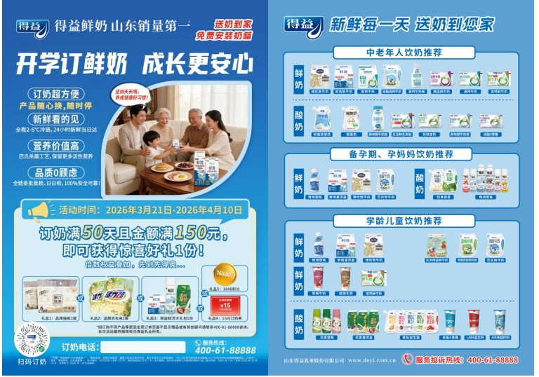 深耕齐鲁三十余载,得益乳业始终坚守“老老实实做企业、干干净净做牛奶”的质量文化,以“种-养-加-质-技-配-售”全产业链自控模式,打造从源头奶源到销售终端的闭环质量管理体系,赢得了广大消费者的长期信赖与市场的高度认可,先后荣获全国液态奶消费者满意度“七冠王”、首批“好品山东”唯一乳企、山东省省长质量奖,更以卓越品质连续16年成为山东两会指定乳制品,并荣膺上海合作组织青岛峰会指定乳制品,成为中国低温奶行业的先行者。 本次得益开学季双月订活动正在火热开展中,3月21日起至4月10日,消费者可通过“得益新鲜订”微信小程序及得益线下门店参与订奶,解锁多重好礼。未来,得益乳业将持续创新产品与服务,不断升级消费体验,以更高品质的鲜活好奶守护全民健康,助力家庭营养升级,让每日一杯得益牛奶成为美好生活的标配!