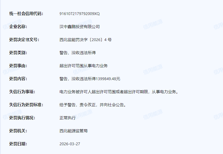 信用能源的官网显示,汉中鑫鹏投资有限公司因超出许可范围从事电力业务,被西北能源监管局警告并没收违法所得139.98万元。处罚决定书文号为“西北监能罚决字〔2026〕4号”,处罚日期为2026年3月27日。