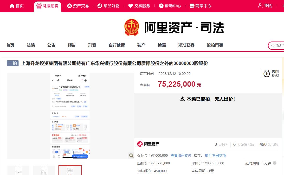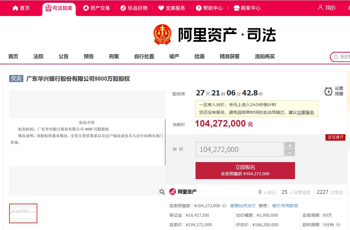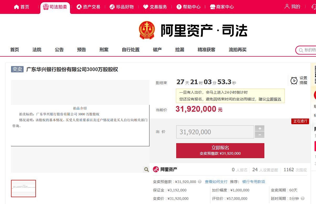 据阿里资产司法拍卖平台显示,广东华兴银行两笔数量分别为3000万股、9800万股的股权正在变卖,当前价分别为3192万元、1.04亿元,每股均价分别为1.06元、1.06元。
