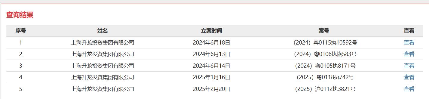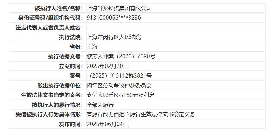据中国执行信息公开网提供的信息显示,升龙投资目前已成为失信被执行人,该公司现存5条失信被执行人记录,涉案总金额1630.66万元,失信被执行人行为具体情形为“有履行能力而拒不履行生效法律文书确定义务”、“违反财产报告制度”,被执行人的履行情况为“全部未履行”。