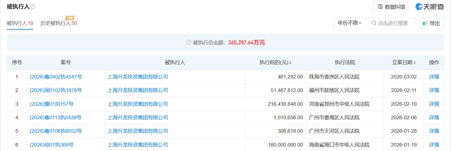 天眼查显示,升龙投资现存19条被执行人记录, 被执行总金额高达26.53亿元。该公司现存13条终本案件信息,执行标的总金额6.66亿元,未履行总金额 6.66亿元,未履行比例100%。