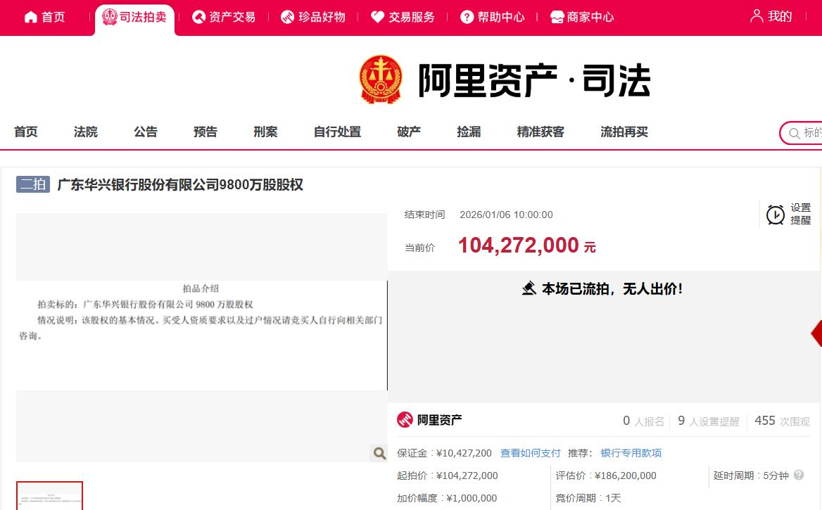 值得注意的是,广东华兴银行上述2笔正在变卖的股权此前已两次流拍。2025年11月,该行9800万股股权首次上架拍卖,起拍价1.30亿元,本场拍卖因“无人出价”而流拍。今年1月,该笔股权第二次拍卖,起拍价降至1.04亿元,较首次拍卖降价2606.80万元,降幅为20%。即便如此,本场拍卖仍旧因“无人出价”而流拍。