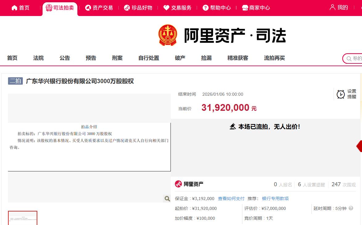 广东华兴银行另外一笔3000万股的股权也出现了同样的情形。2025年11月,该笔股权首次上架拍卖,起拍价3990万元,本场拍卖因“无人出价”而流拍。今年1月,该笔股权第二次拍卖,起拍价降至3192万元,较首次拍卖降价798万元,降幅为20%。即便如此,本场拍卖仍旧因“无人出价”而流拍。
