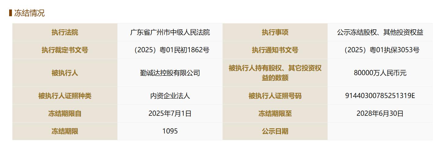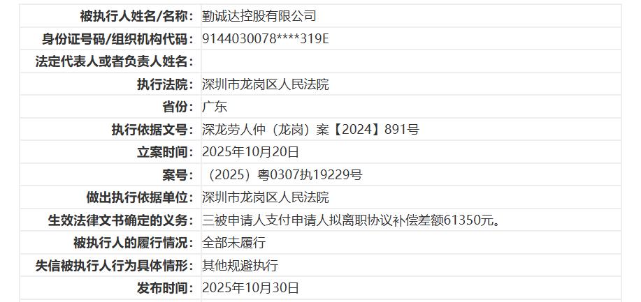 据了解,广东华兴银行第三大股东勤诚达控股有限公司目前也成为失信被执行人,该股东持有的该行全部股份(8亿股)已多次被司法冻结。2025年10月,该股东被深圳市龙岗区人民法院列入失信被执行人名单,涉案总金额 6.14万元,失信被执行人行为具体情形为“其他规避执行”,被执行人的履行情况为“全部未履行”,立案日期为2025年10月20日。