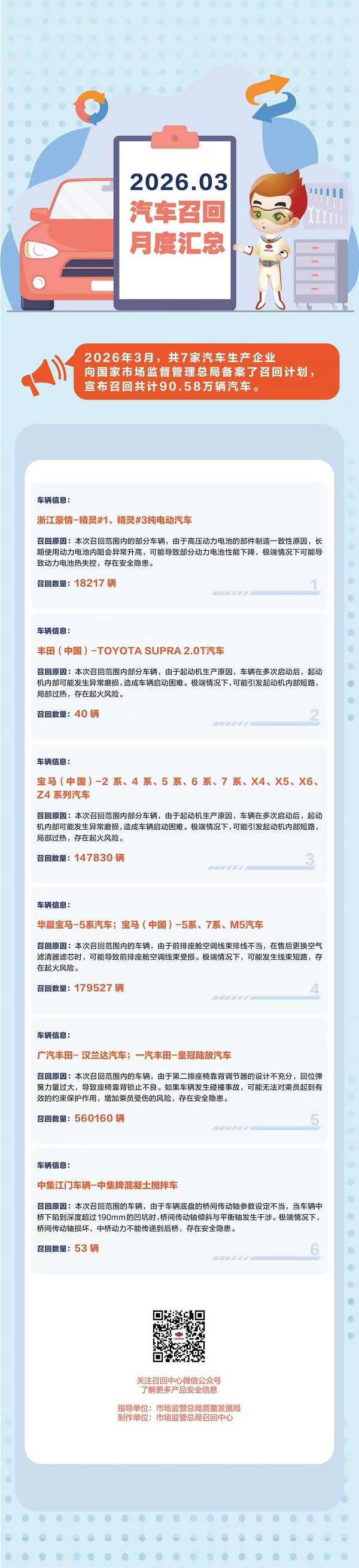 国家市场监管总局网站7日披露《2026年3月汽车召回月度汇总》指出,2026年3月,共7家汽车生产企业向国家市场监督管理总局备案了召回计划,宣布召回共计90.58万辆汽车。