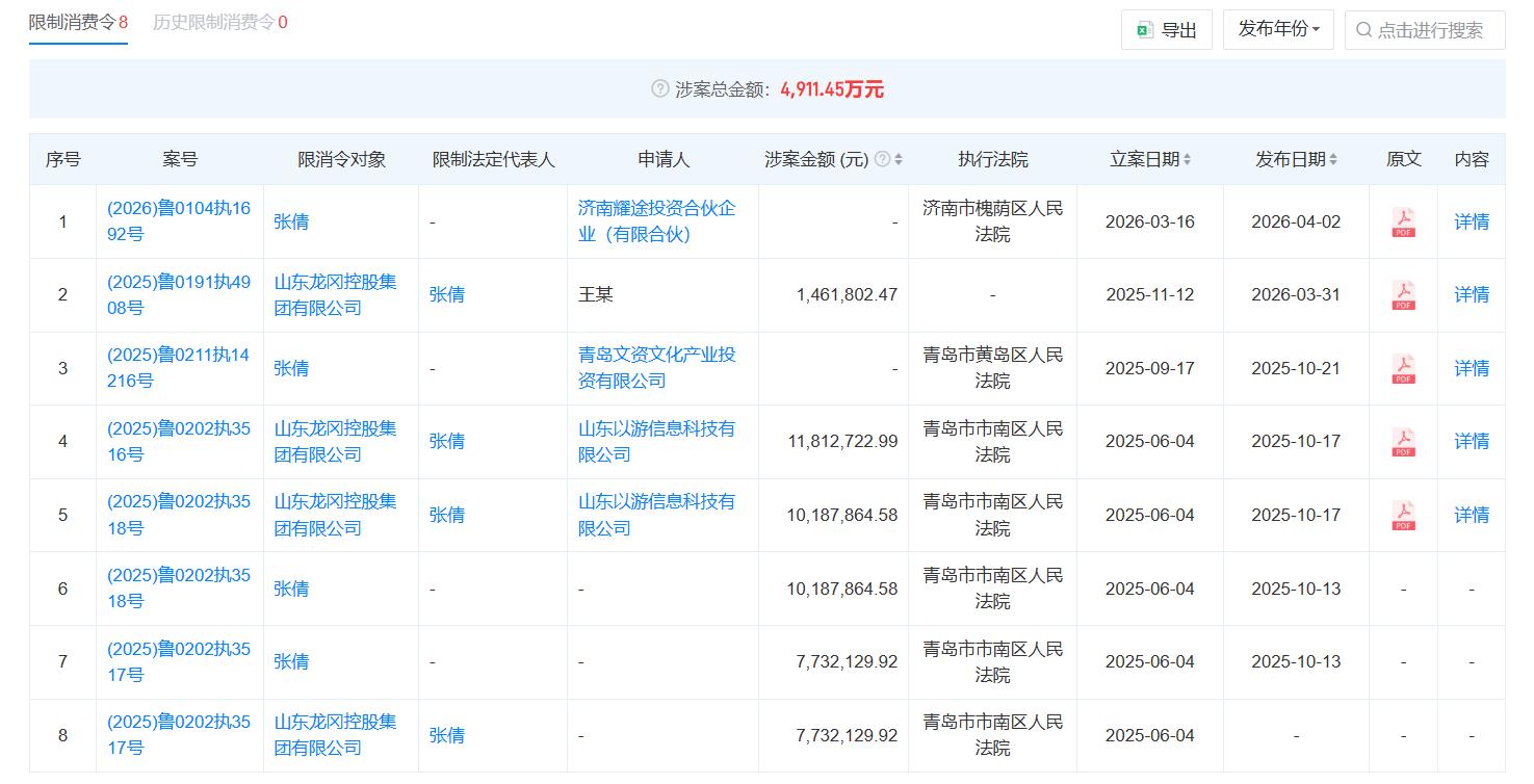 截至目前,张倩已8次被法院限制高消费,涉案总金额4911.45万元。其中,涉及2起民间借贷纠纷案件,因张倩和山东龙冈控股集团有限公司未按执行通知书指定的期间履行生效法律文书确定的给付义务,分别被青岛市市南区人民法院和济南市槐荫区人民法院采取限制消费措施。
