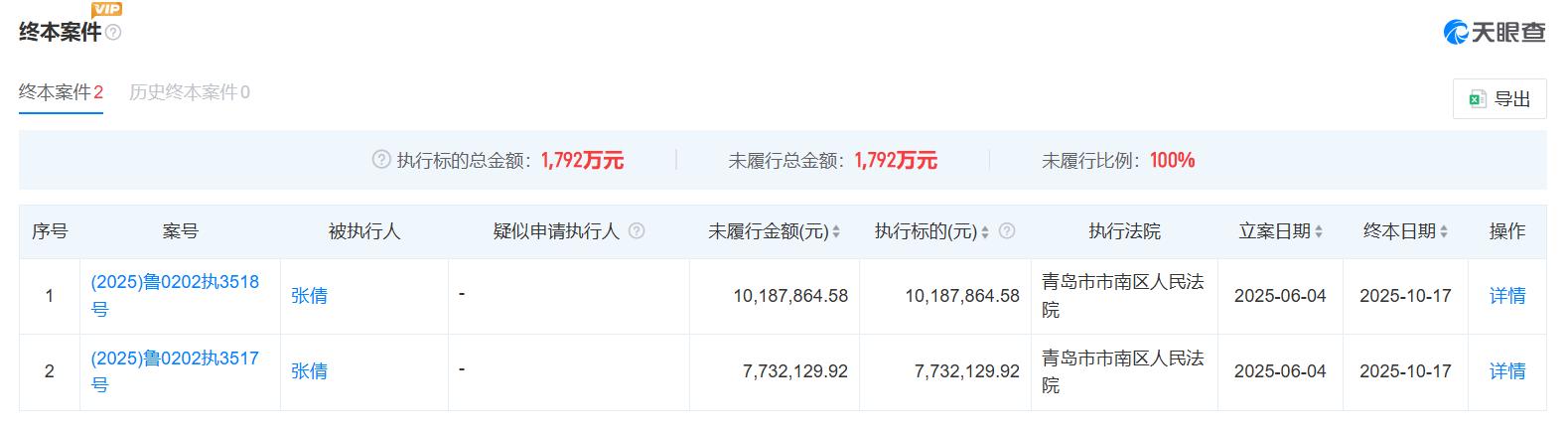 3月30日,张倩被济南市槐荫区人民法院列入失信被执行人名单,失信被执行人行为具体情形为“违反财产报告制度”,被执行人的履行情况为“全部未履行”,立案时间为2026年3月16日。