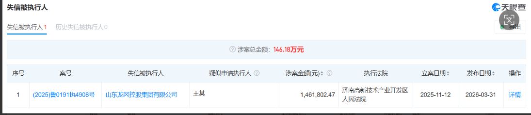 公开资料显示,张倩现任两家企业的法定代表人。其中,张倩直接持有山东龙冈控股集团有限公司95%的股份,为该公司的实际控制人。3月31日,该公司被济南高新技术产业开发区人民法院列入失信被执行人名单,涉案总金额146.18万元,失信被执行人行为具体情形为“其他规避执行”,被执行人的履行情况为“全部未履行”。