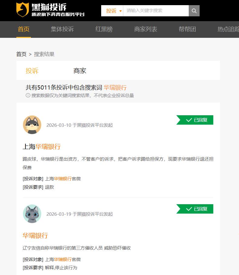截至发稿,黑猫投诉平台关于华瑞银行的投诉量已突破5000条,其中多起投诉涉及该行通过携程金融等第三方平台放贷引发的暴力催收问题。 例如,3月24日,网友投诉称,“我通过携程金融向华瑞银行借的款,因为资金困难逾期,但是华瑞银行一直通过私人电话号码,每天多次向我发送短信,暴力催收,内容包含威胁恐吓。我要求华瑞银行停止暴力催收,向我赔礼道歉,赔偿精神损失。” 3月6日,网友投诉称,“本人2025年12月在携程APP上使用了由华瑞银行出资的信用贷,2026年3月6日在本人未失联的情况下,未经本人允许,私自使用私人号码向家人发威胁恐吓短信,暴力催收,侵犯他人隐私,何况我在携程上填写的紧急联系人并不是我的父母。” 4月12日,另一名网友也投诉称,“本人通过携程金融办理贷款,出资方为上海华瑞银行。本人逾期后,华瑞银行委托天津明东华融资担保有限公司及辽宁友信进行催收,存在多项严重违法违规行为:1. 软暴力催收,辽宁友信持续发送恐吓短信、短信轰炸、微信骚扰,威胁冻结本人银行卡、微信支付宝,严重干扰正常生活。2. 违规跨省展业,天津明东华(注册地天津)违规委托辽宁友信在河北属地催收,违反《融资担保公司监督管理条例》。3. 泄露个人信息,未经本人授权,将手机号、身份信息泄露给第三方催收,违反《个人信息保护法》。4. 推诿责任,华瑞银行以‘催收由第三方负责’为由推诿,拒不履行管理责任。” (山东财经网)