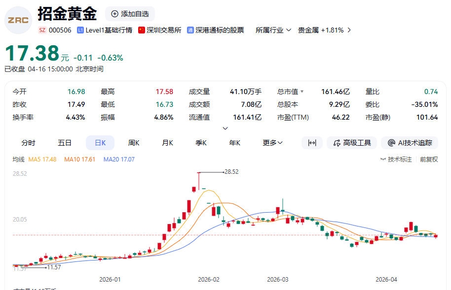 二级市场上,截至4月16日收盘,招金黄金下跌0.63%,报收于17.38元/股,全天换手率4.43%,成交量41.10万手。
