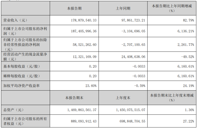 4月15日晚,招金黄金(000506.SZ)披露2026年一季报,报告期实现营业收入1.79亿元,同比增长82.79%;归母净利润1.87亿元,同比大增6136.21%(去年同期为亏损310.47万元);扣非归母净利润5852.13万元,同比增长2261.77%(去年同期为亏损270.71万元)。