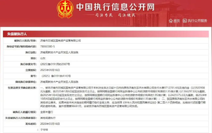 近日,据中国执行信息公开网信息,济南历城控股集团有限公司(以下简称“历城控股集团”)全资子公司济南市历城区国有资产运营有限公司(以下简称“历城国资运营”)被济南高新技术产业开发区人民法院列入“失信被执行人”名单,执行依据文号为(2025)鲁0191民初2987号。