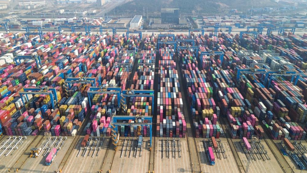 正在进行集装箱装卸作业的青岛港全自动化集装箱码头(无人机照片)。 新华社记者 徐速绘 摄