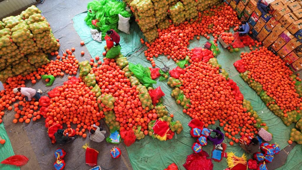 工作人员在山东寿光农产品物流园整理销往全国各地的蔬菜(无人机照片)。 新华社记者 徐速绘 摄
