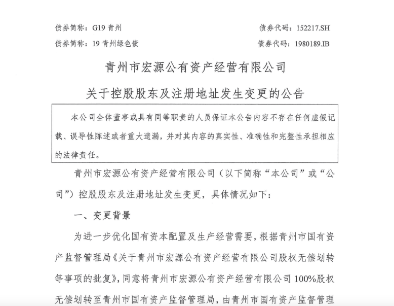 4月21日,青州市宏源公有资产经营有限公司(下称“青州宏源”)发布关于控股股东及注册地址发生变更的公告。公告显示,为进一步优化国有资本配置及生产经营需要,根据青州市国有资产监督管理局《关于青州市宏源公有资产经营有限公司股权无偿划转等事项的批复》,同意将青州宏源100%股权无偿划转至青州市国有资产监督管理局,由青州市国有资产监督管理局履行企业出资人职责;同意青州市宏源公有资产经营有限公司住所由山东省潍坊市青州市范公亭西路1035号变更至山东省潍坊市青州市王府街道驼山中路3555号106室。