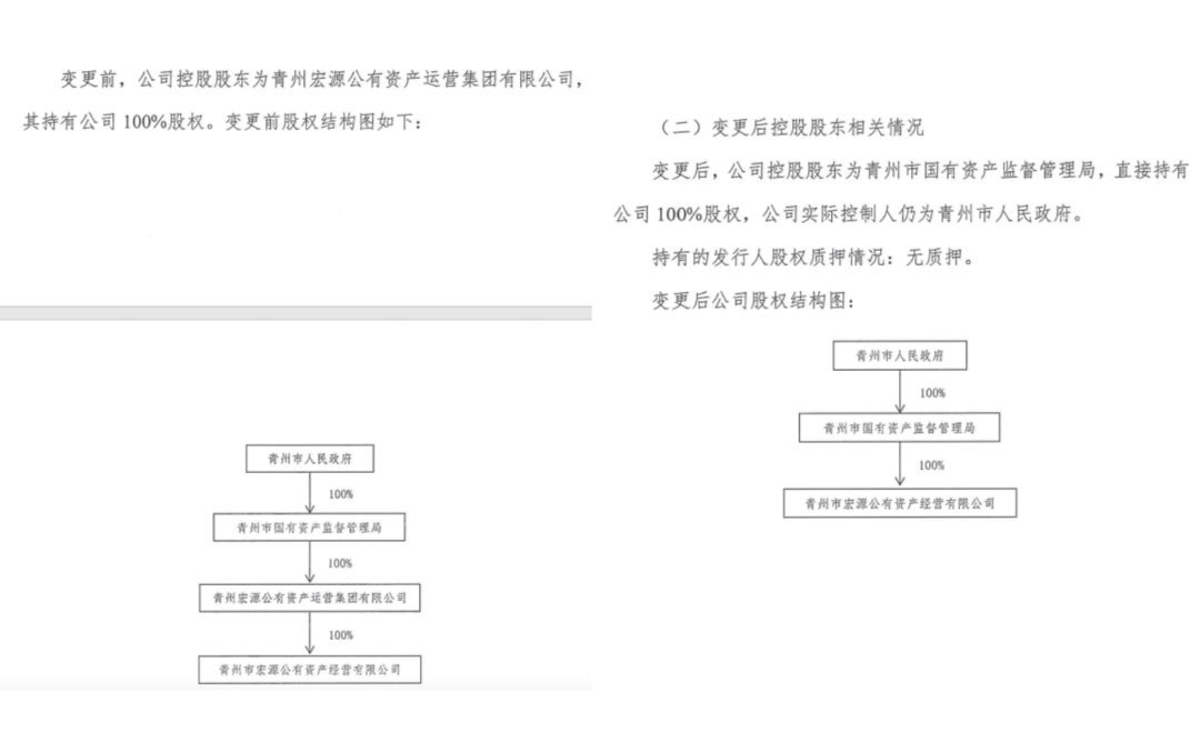 本次变更前,青州宏源控股股东为青州宏源公有资产运营集团有限公司(下称“宏源集团”),其持有公司100%股权。变更后,公司控股股东为青州市国有资产监督管理局,直接持有公司100%股权,公司实际控制人仍为青州市人民政府。